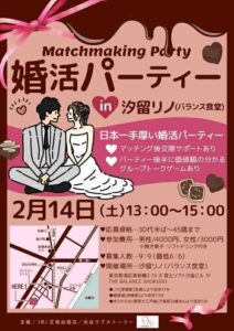 婚活パーティーin汐留 パーティー概要 2026年1月10日(土)13時~15時対 象:30代の方参加費:男性¥4,000 女性¥3,000場 所:汐留Lino(汐留駅より徒歩5分) 詳細はチラシをご覧ください♪ 特典 […]